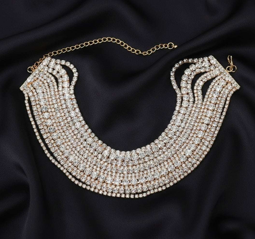 A bold, multi-row choker designed to catch the light from every angle. Crafted in gold-toned copper and layered with high-shine rhinestones, it delivers instant impact with a sleek, stacked silhouette. Adjustable for a close, confident fit (30.9 cm + 14 cm extension).— this is a statement, not an accessory.